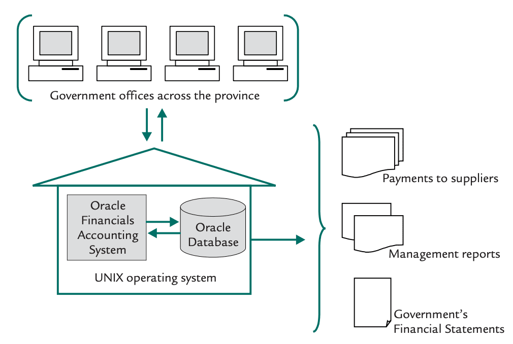 Diagram showing how CAS works, including it’s Oracle accounting system and database that exchanges information with government offices across the province and makes payments to suppliers, provides management reports and the government’s financial statements.